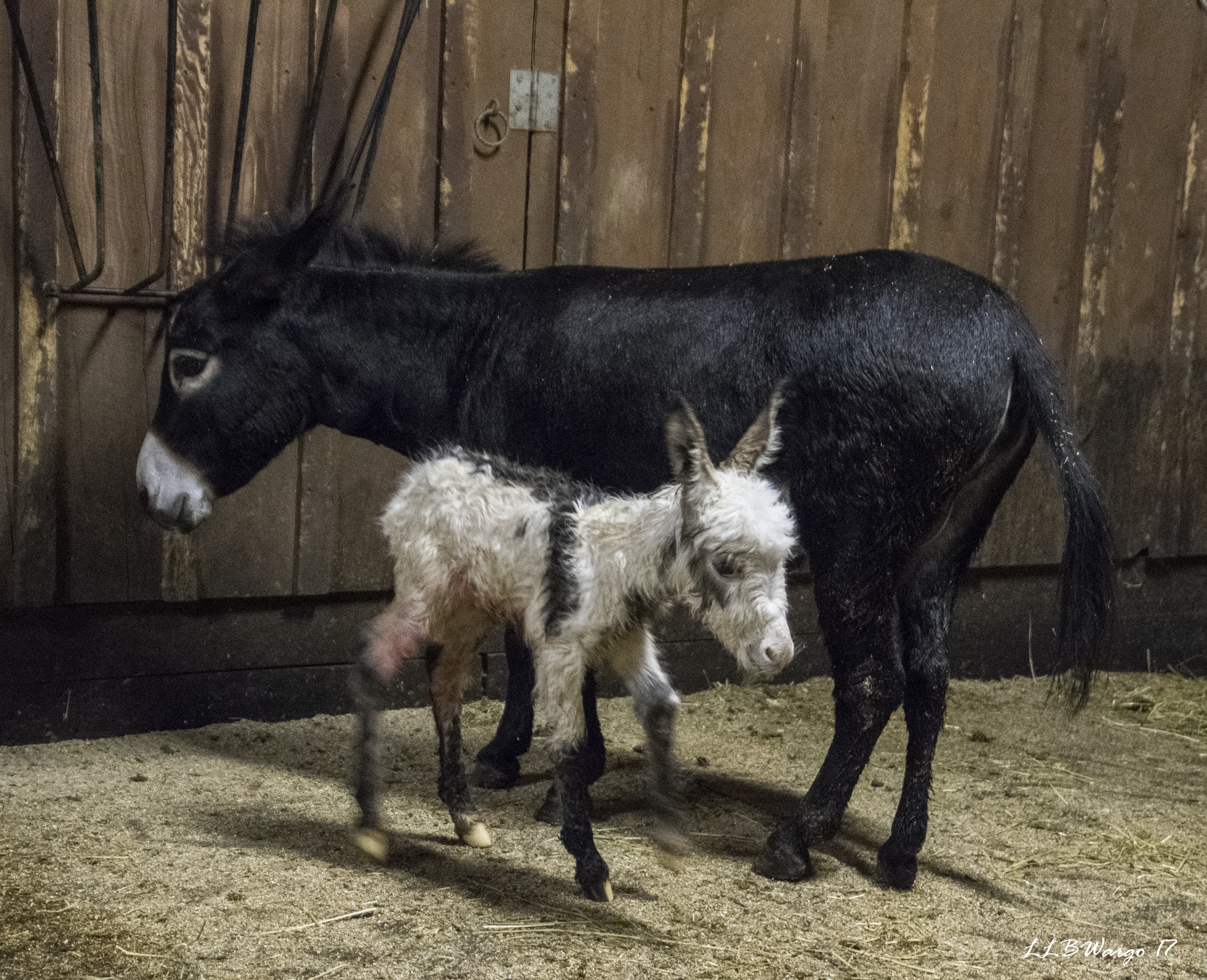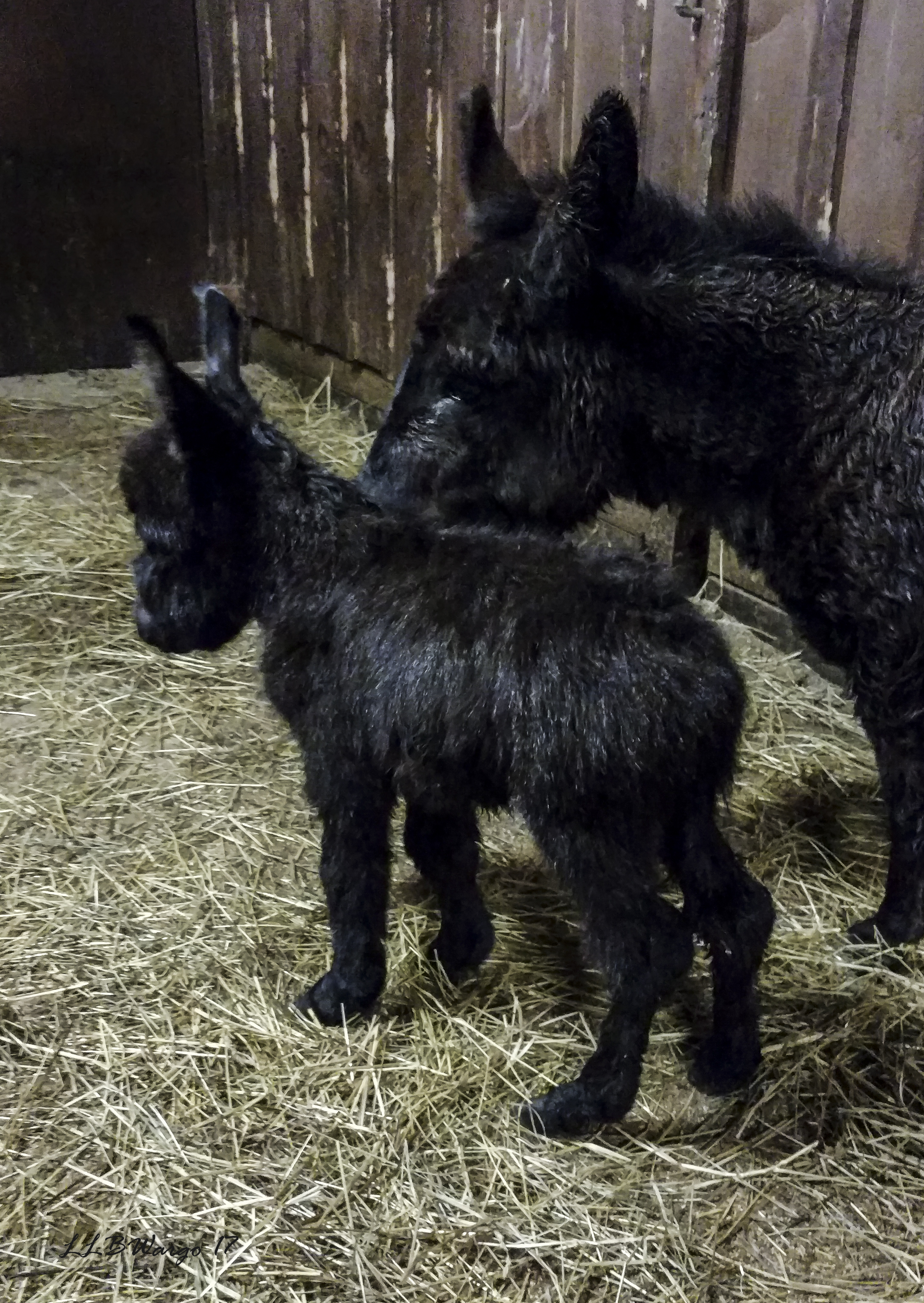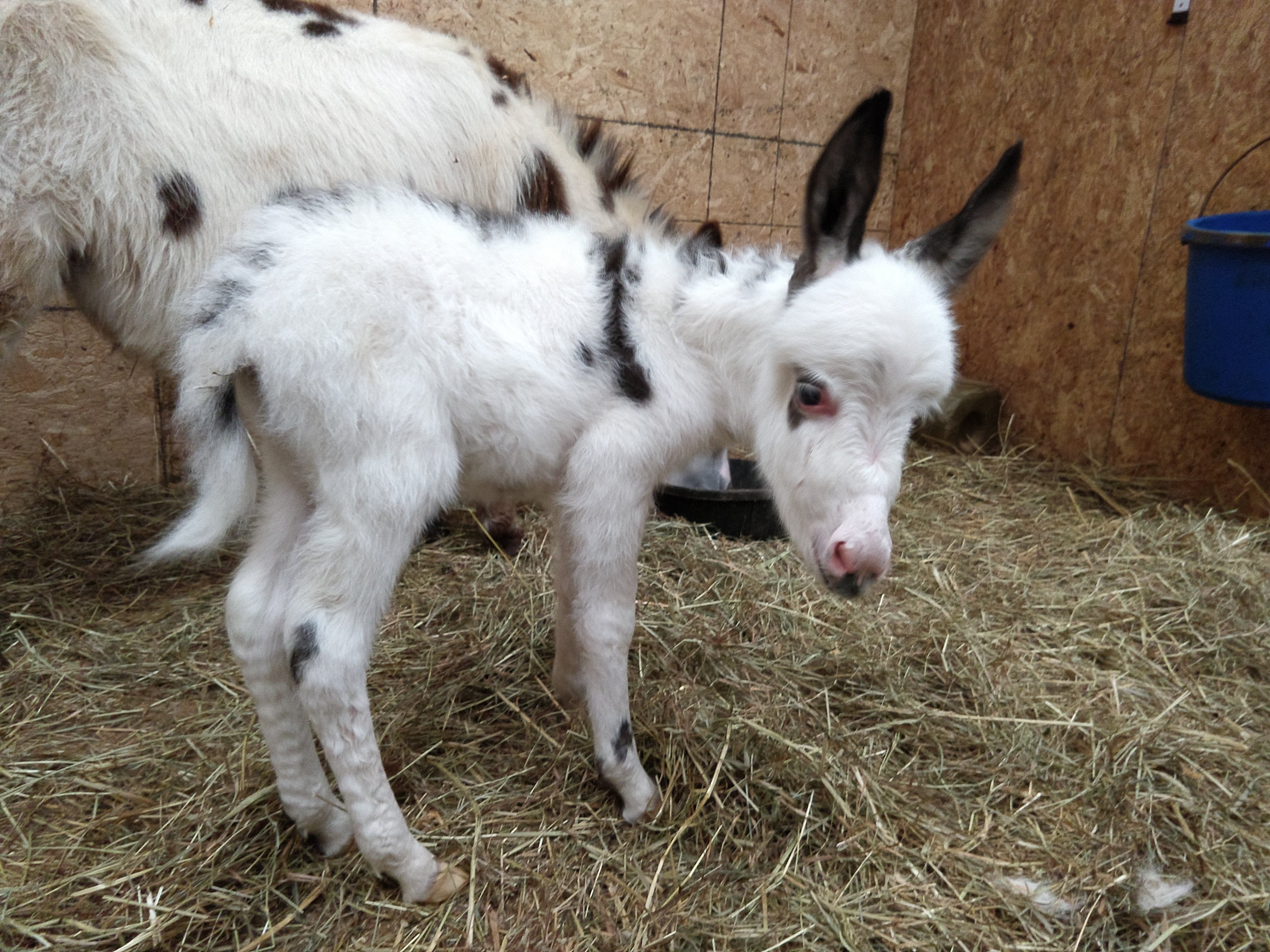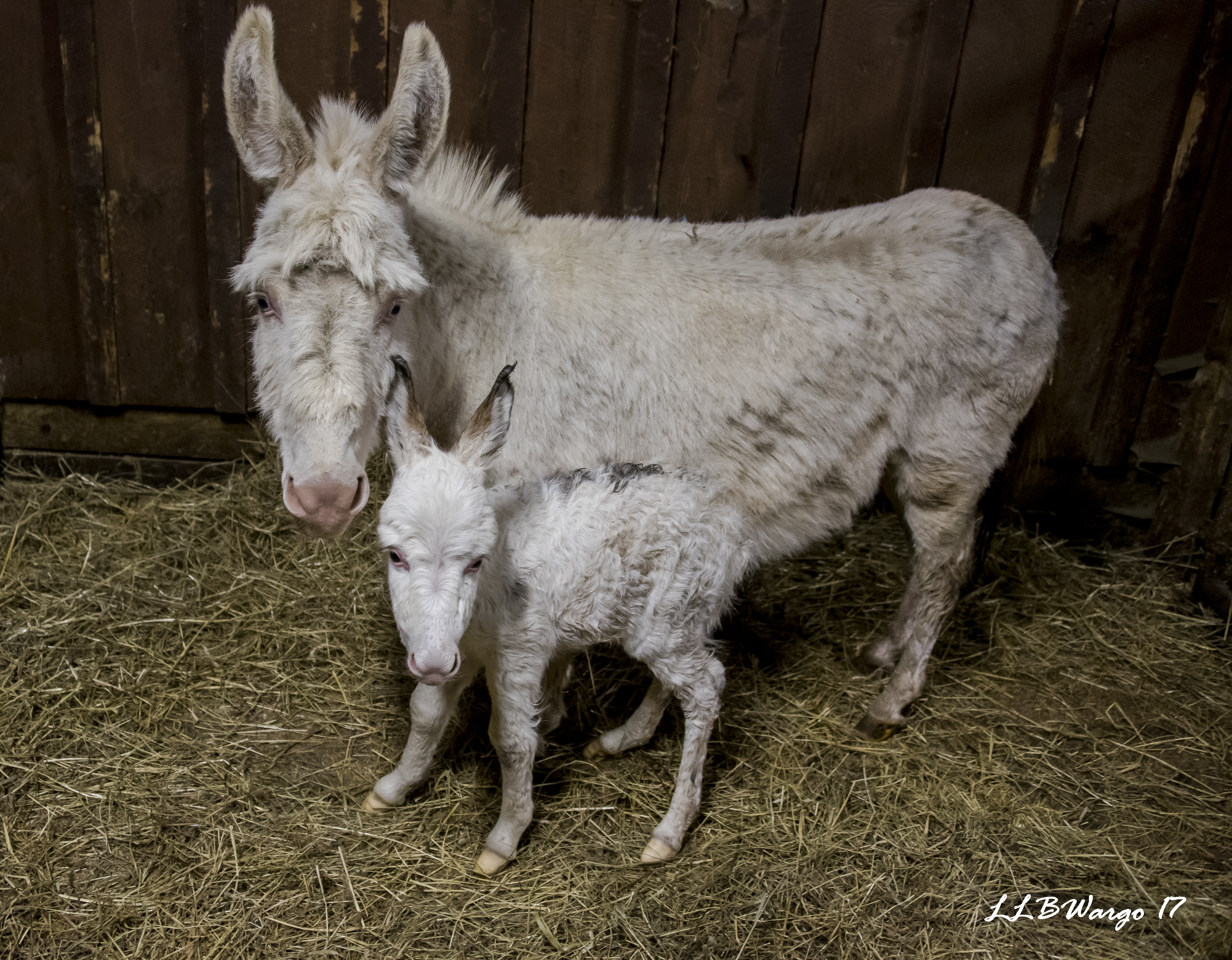 Our only foal for this year. Retirement still gave us one foal this year. Our little Jack Lester finally has proof that he is a real studly muffin!! He and Ivy have done us proud by creating this little ivory carrier jennet Northend’s Terrific Theresa! Since he was just a beginner we had no idea when his first foal was due. I’m glad she arrived before the year was out and during a warm spell in December!