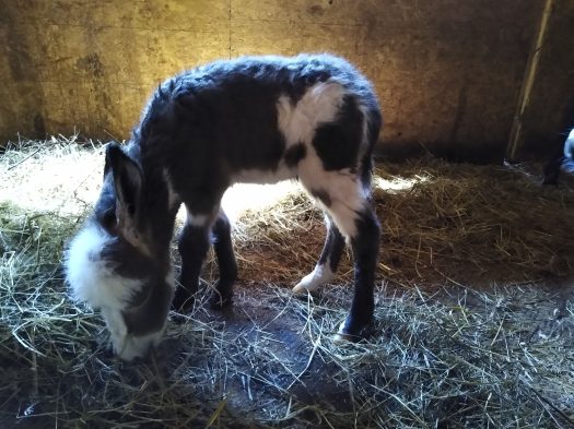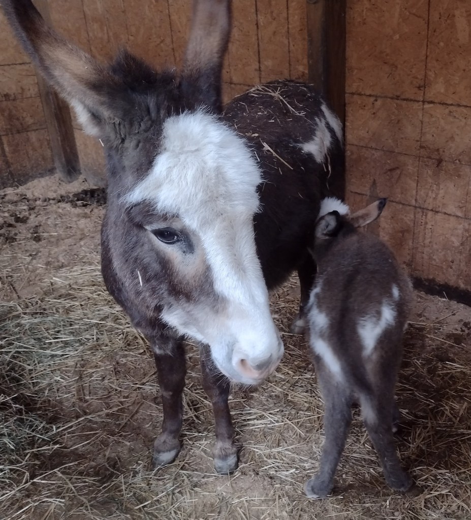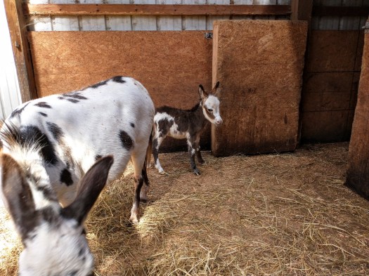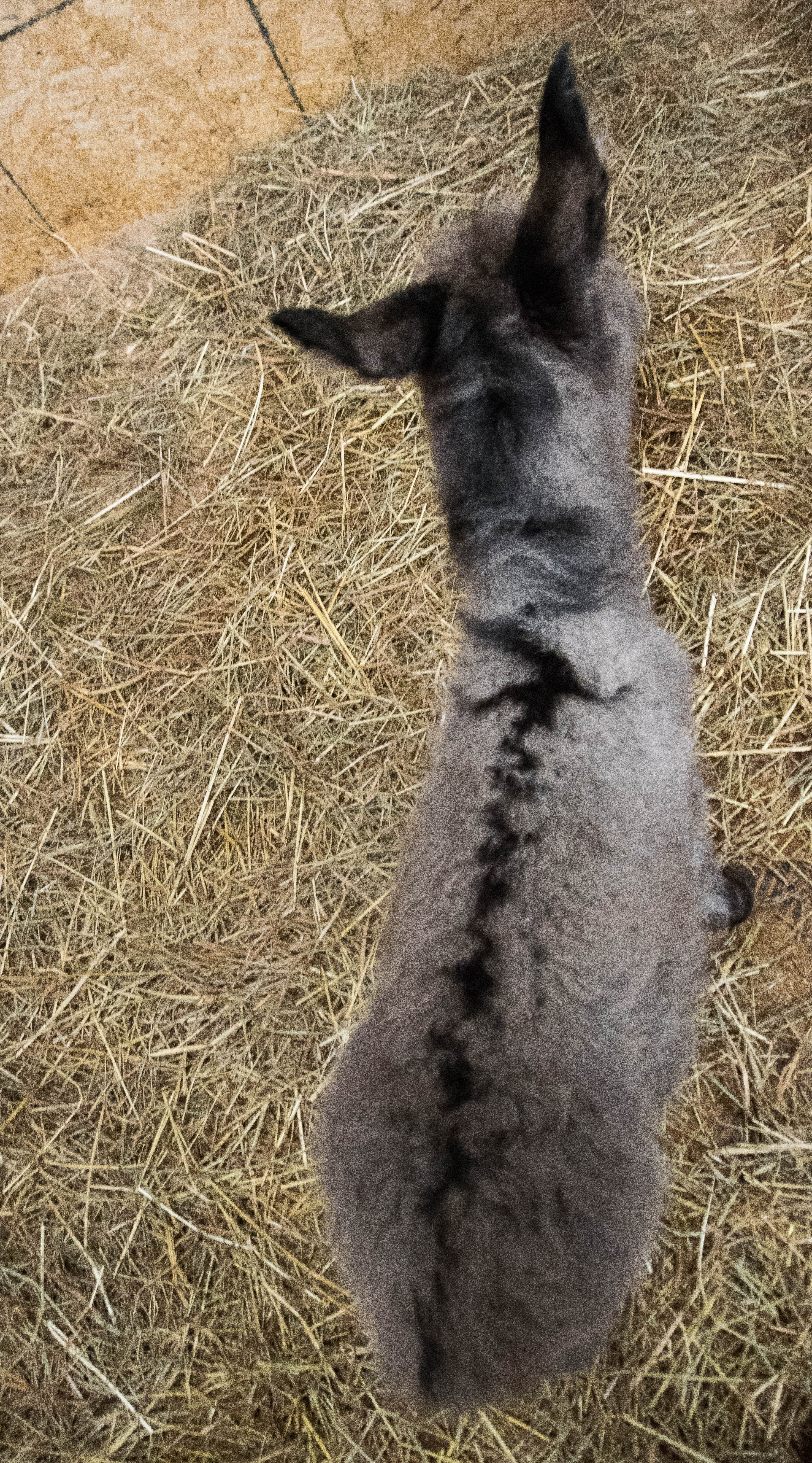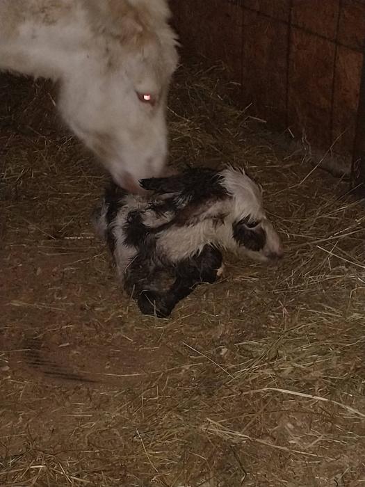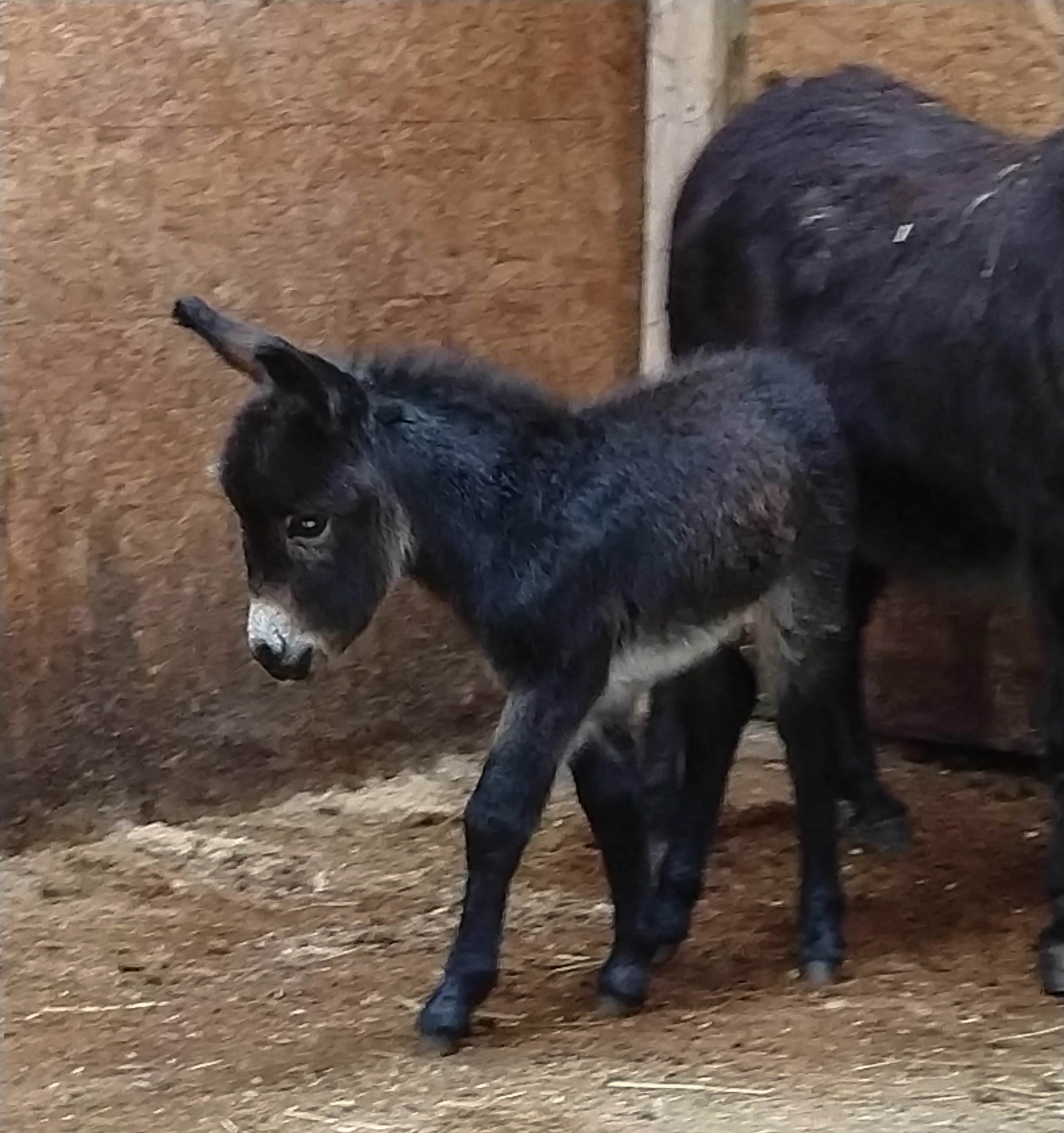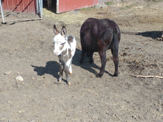 Our only foal for this year. Retirement still gave us one foal this year. Our little Jack Lester finally has proof that he is a real studly muffin!! He and Ivy have done us proud by creating this little ivory carrier jennet Northend’s Terrific Theresa! Since he was just a beginner we had no idea when his first foal was due. I’m glad she arrived before the year was out and during a warm spell in December!