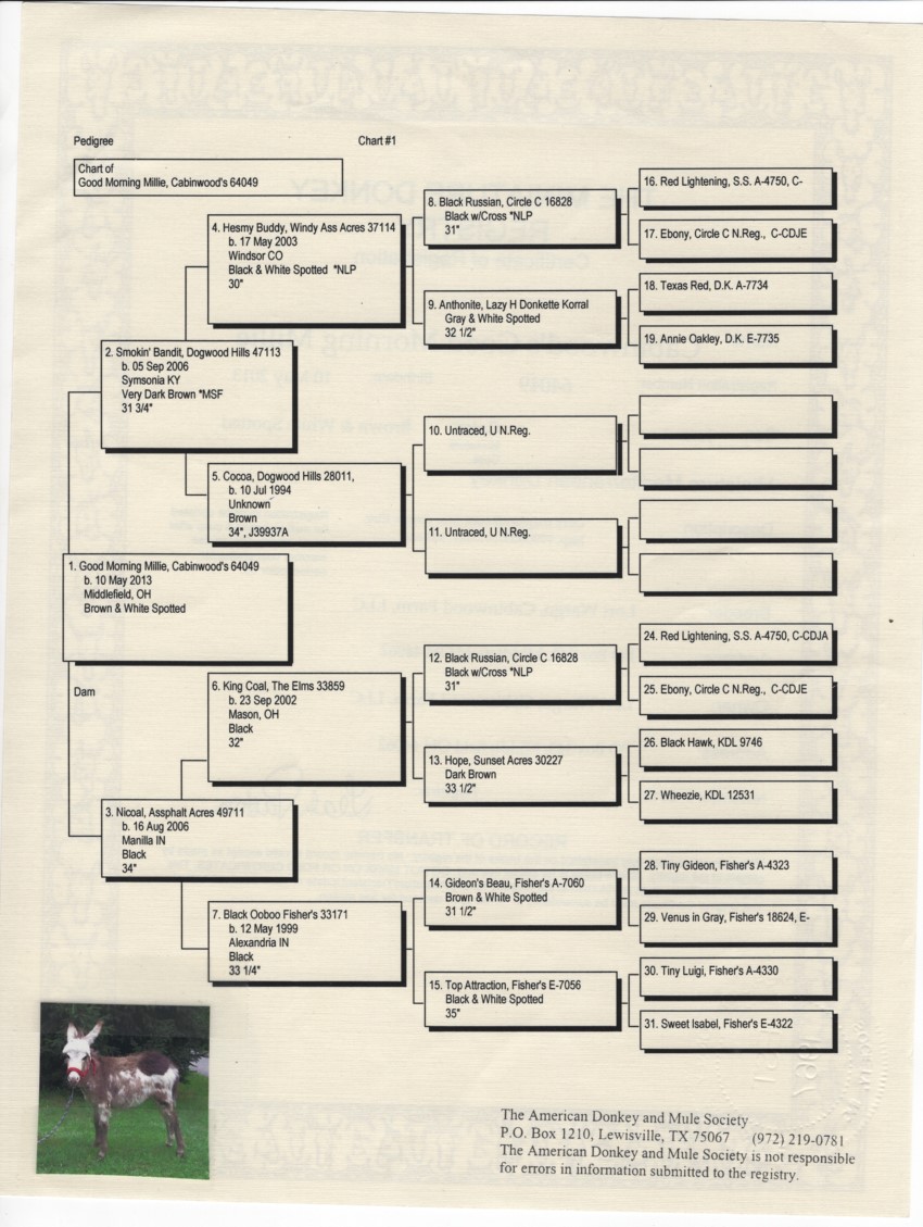 Millie gave birth to her first foal in March 2017. Her name is Cabinwood’s Susan Ellen. Her second foal arrived in August 2018 and her name is Northend’s Calixta. In May 2020 a jack named Northend’s Donovan and A beautiful jennet foal named Go Ask Alice in 2021 and in 2023 a very handsome jack named Clark! In 2025 she gave us a beautiful jennet named Dorie Anne!